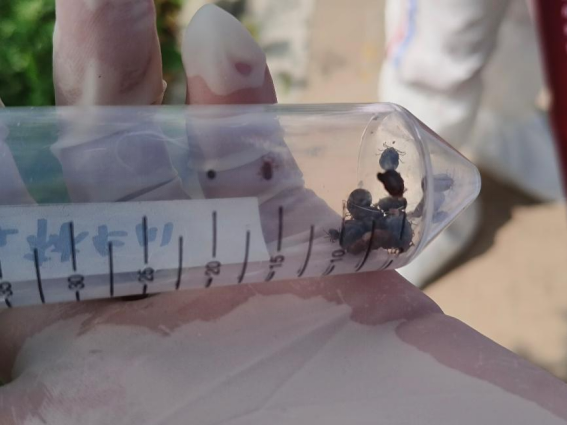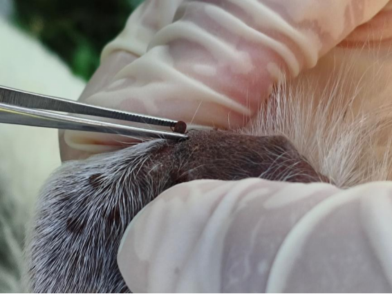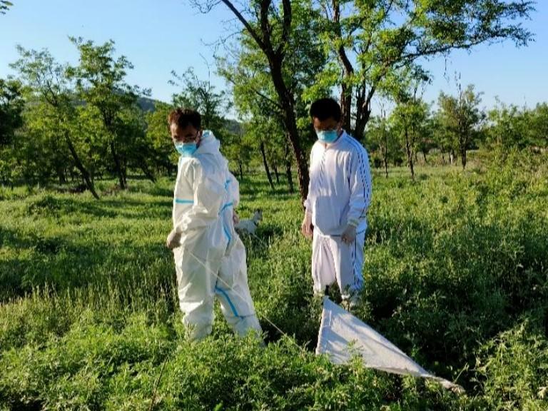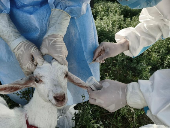 当天下午,监测团队抵达大濠村畜牧养殖集中区。在黑山卫生院的协助下,团队成员身着防护服,携带专业采样工具,对该村2个养殖户的绵羊展开系统性检查。监测重点聚焦动物耳廓、眼周、口鼻、颈部等蜱虫易寄生部位,采用“宿主体检蜱法”进行地毯式排查。现场操作中,团队成员以镊子精准夹取寄生蜱虫,严格遵循“一宿主一管”原则,将标本按雌雄、饱血状态等特征分类封装于促凝管中,并同步记录宿主品种、年龄、寄生部位等数据。