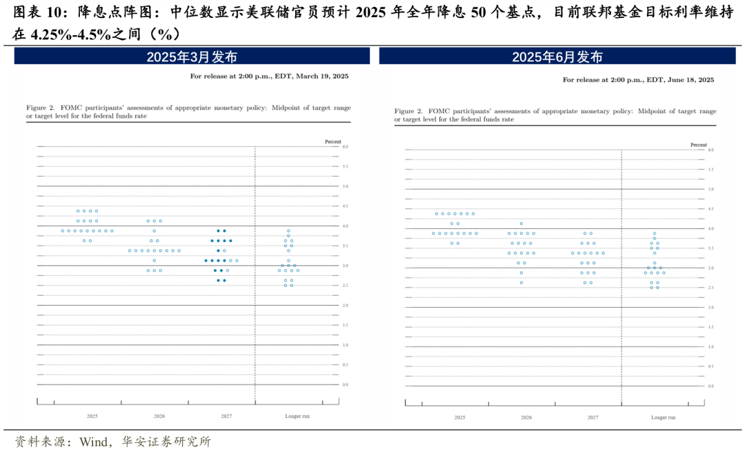 市场降息预期较美联储更乐观: 6日CME FedWatch最新数据显示,市场预计2025年全年降息3次(9月降息25BP的概率约为92%,降息50BP的概率约为8%)。其中9月不降息的概率已降至0,非农数据公布前为0.6%。此前,美联储6月会议中位数暗示2次降息(50个基点),但近期以来内部分歧度增加,部分官员上调预计的降息幅度。市场预期全年进行3次降息(共75个基点),较此前美联储会议的降息次数更多、幅度更大。
