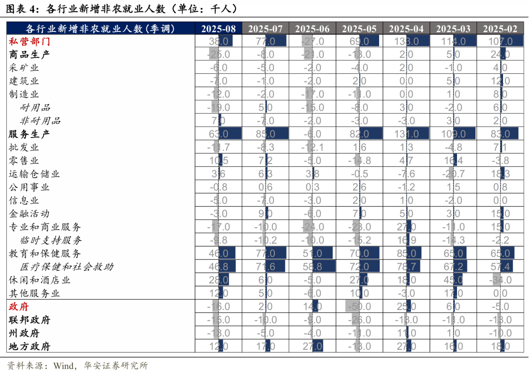 8月新增就业分行业看,私营部门边际新增较上月减少近半数,政府部门新增数降为负值,8月新增就业依赖私营部门支撑。私营部门仍以服务业为主,教育和医疗创造了最多的新增就业,休闲和酒店业边际新增较显著(+2.8万)。但商品生产类就业承压,新增就业减少2.5万。其中耐用品、制造业、建筑业损失最多。本月非农新增,商品生产类、政府部门均出现就业损失,而核心服务业除教育和医疗以外,其他行业亦面临就业困境。