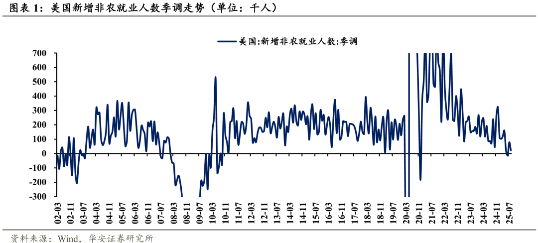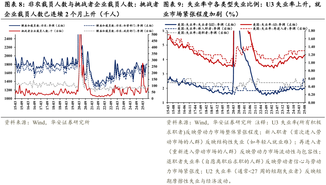 此外, 6月数据连续两月下修后,当前就业数据类似去年8月的水平。上月,6月非农新增数据从14.7万人下修至1.4万人,5月非农数据从13.9万人修正至1.9万人。本月,备受瞩目的6月非农新增数据再度下修,从1.4万人再下修至-1.3万人。修正后的数据显示,自2025年5月以来,美国非农新增数据呈现断崖式下跌。非农新增连续四个月处在低位区间,近3年只有2024年6月~8月出现了类似的情况,而当前无论是非农新增数的水平(本次均值2.6万,去年均值8.2万)、连续处于低值的时间(本次4个月,去年3个月)、还是U3失业率(本次4.3%,去年4.2%),均较2024年同期更加疲弱,故参考2024年9月50BP的降息幅度,本次降息50BP也具备可能性。