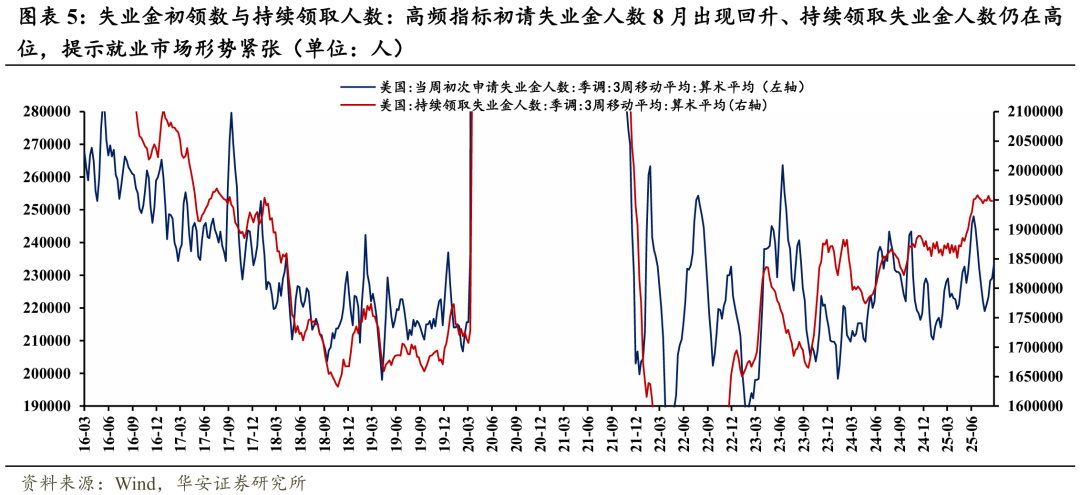 失业金申领人数看,8月初请失业金人数出现回升,持续申请失业金人数仍在高位,处于近四年最高水平附近。职位空缺数看,7月非农职位空缺数降低,低于预期值(737.8万人),暗示就业市场维持疲软。裁员数据看,根据第三方机构调查报告,8月企业裁员人数达85979人,已连续2个月走高,较去年同期(75891人)亦有所上升。