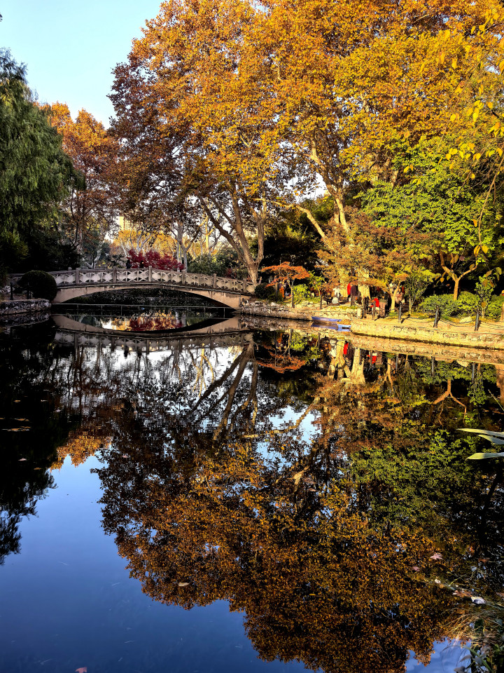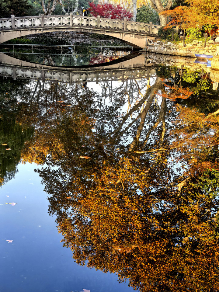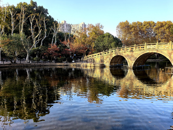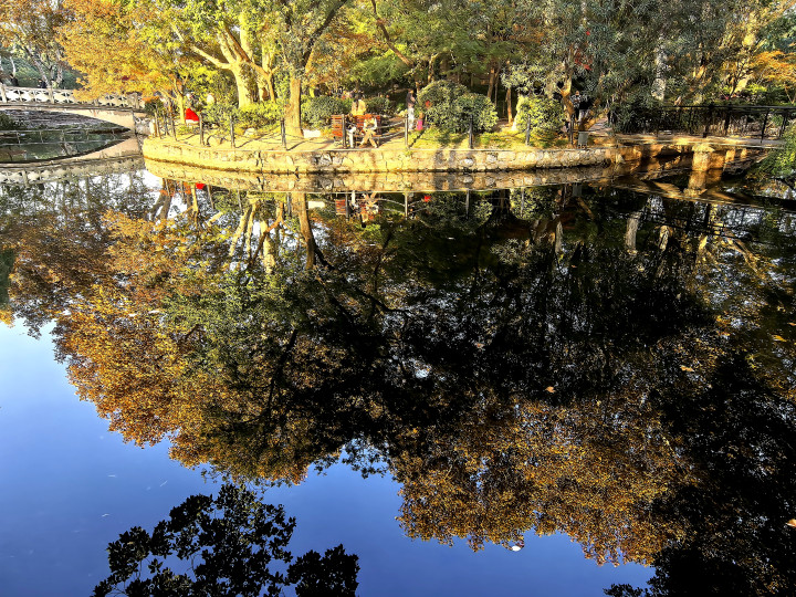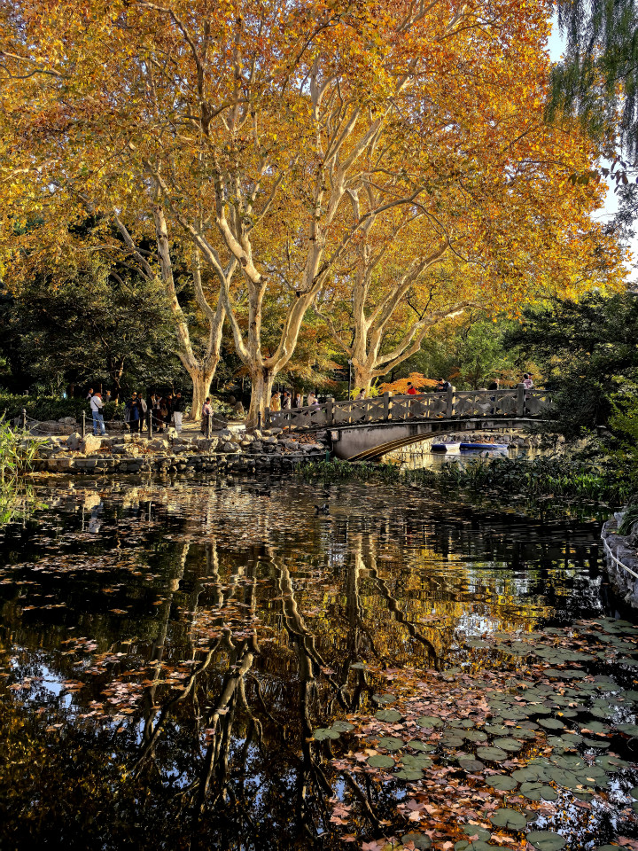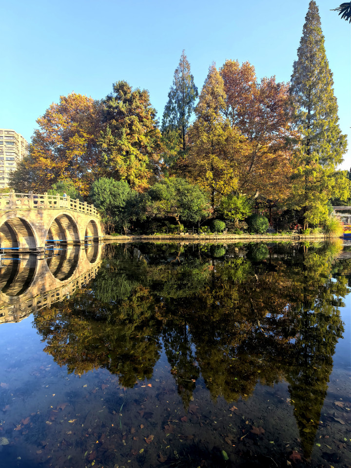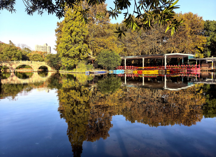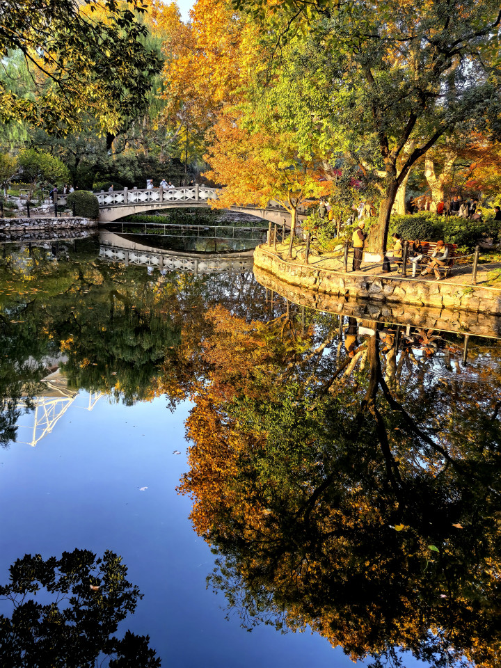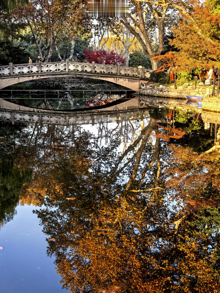 湖边的秋色,几座小秋连接着湖中的小岛和小河。