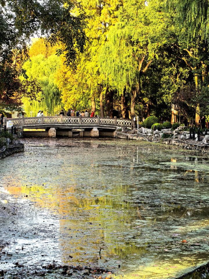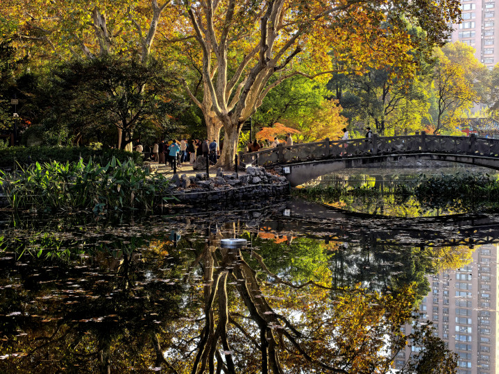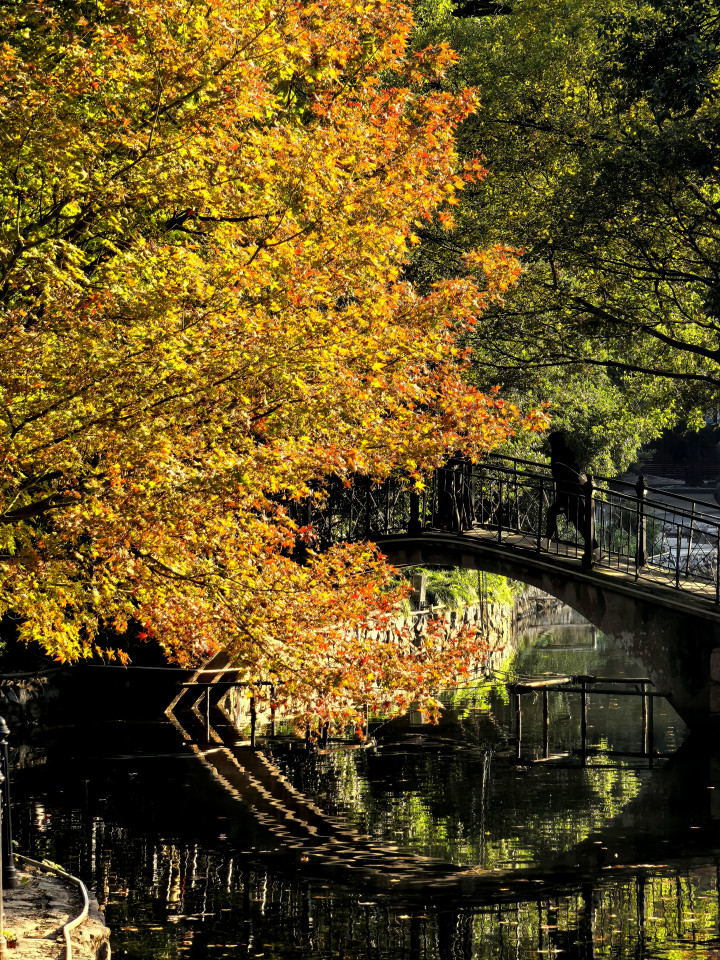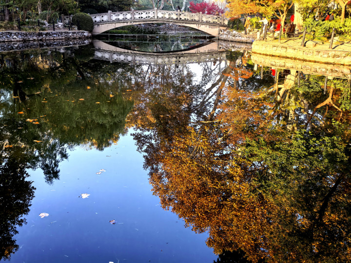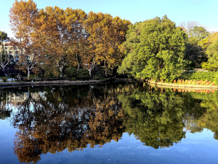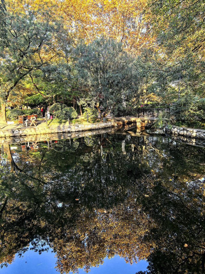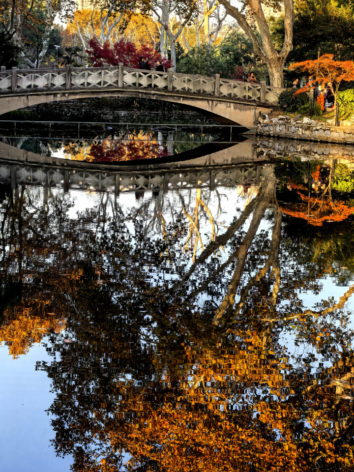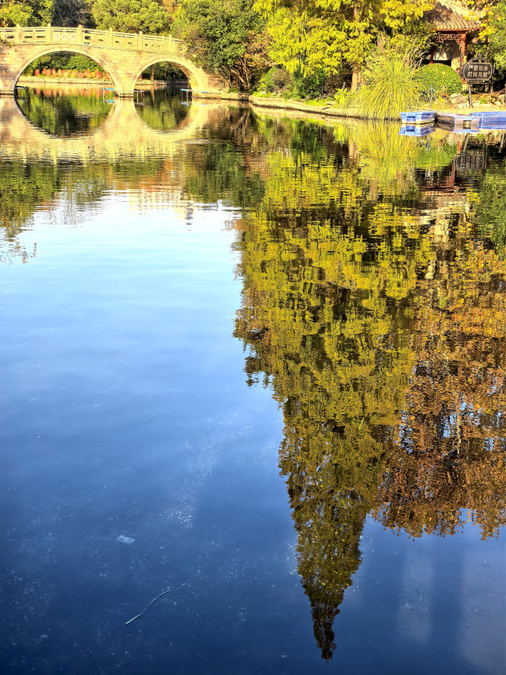 湖边的秋色,几座小秋连接着湖中的小岛和小河。