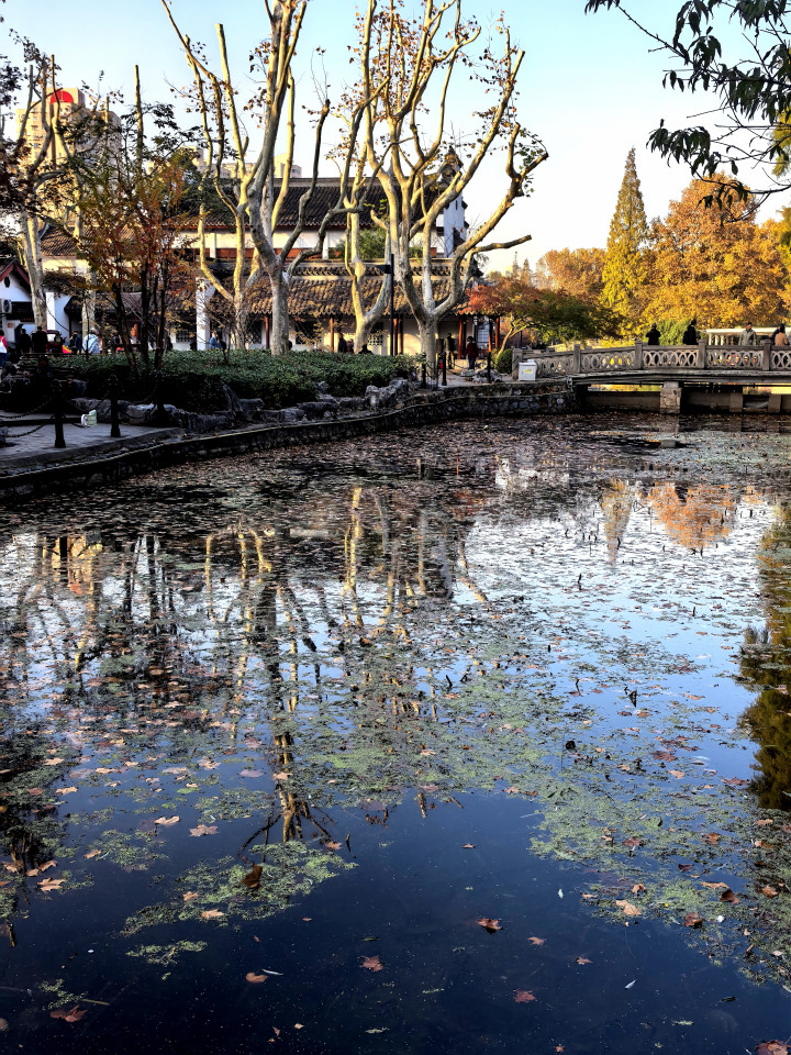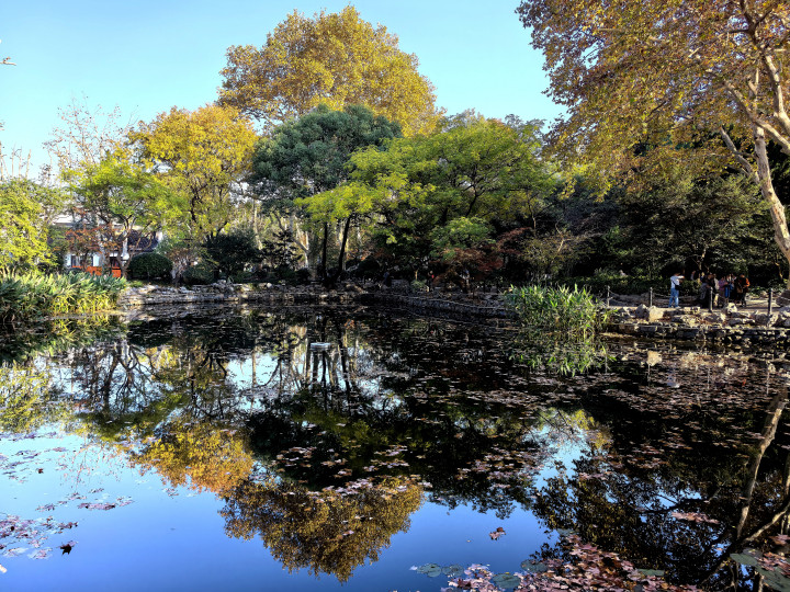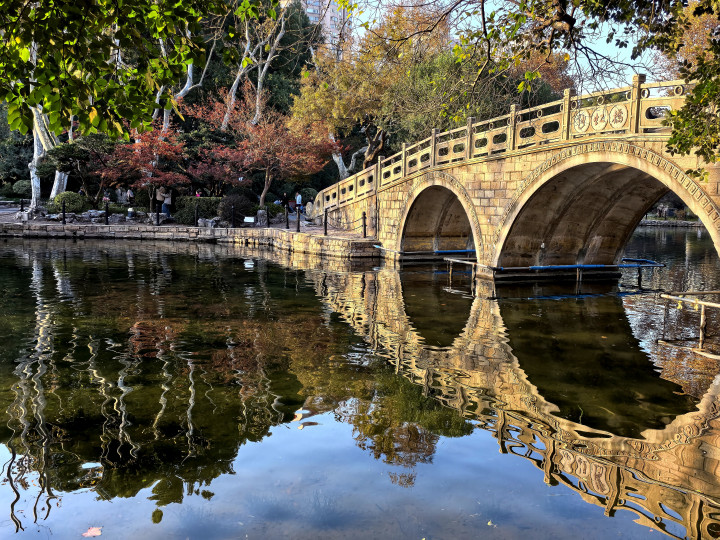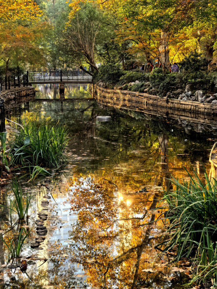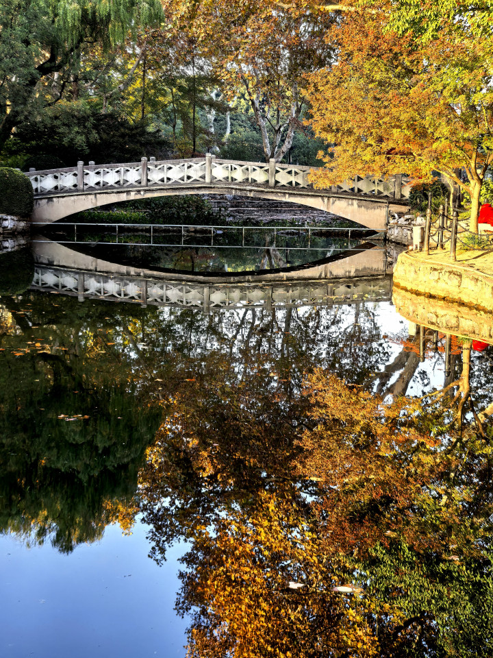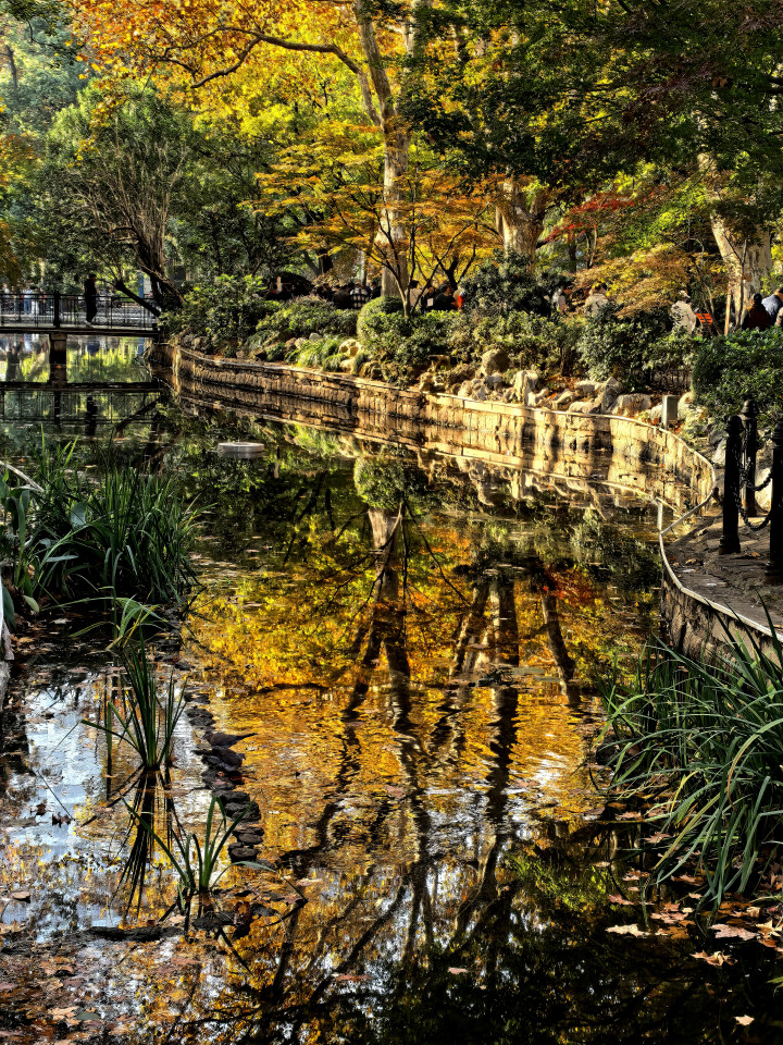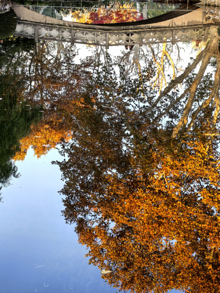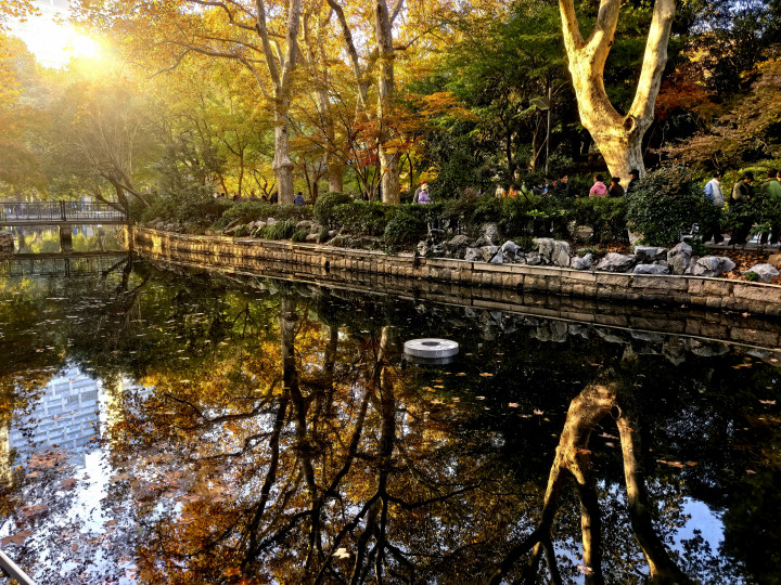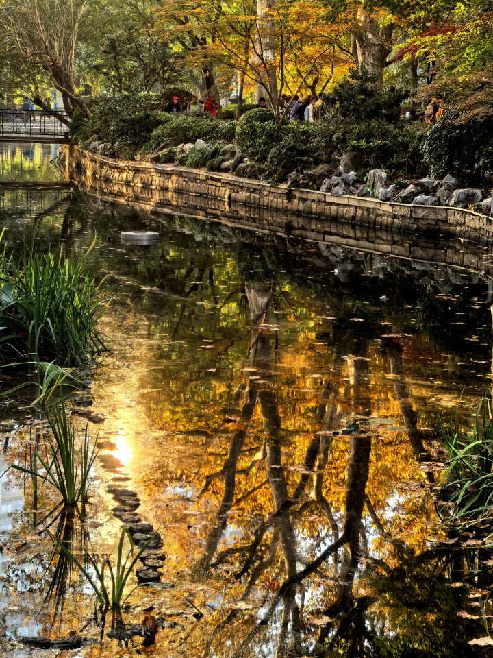 湖边的秋色,几座小秋连接着湖中的小岛和小河。