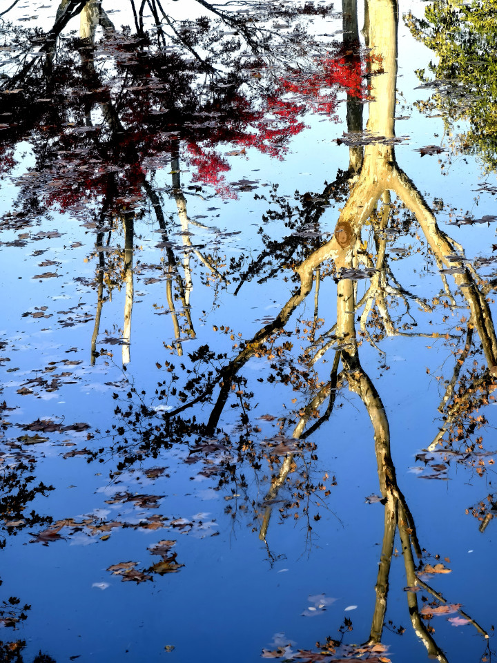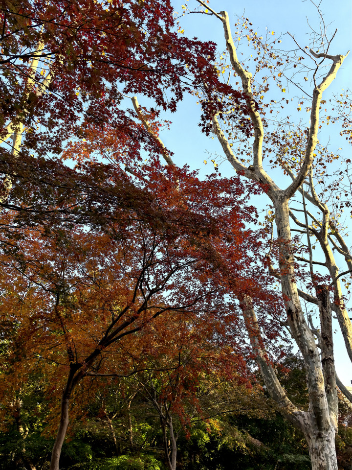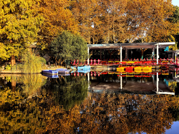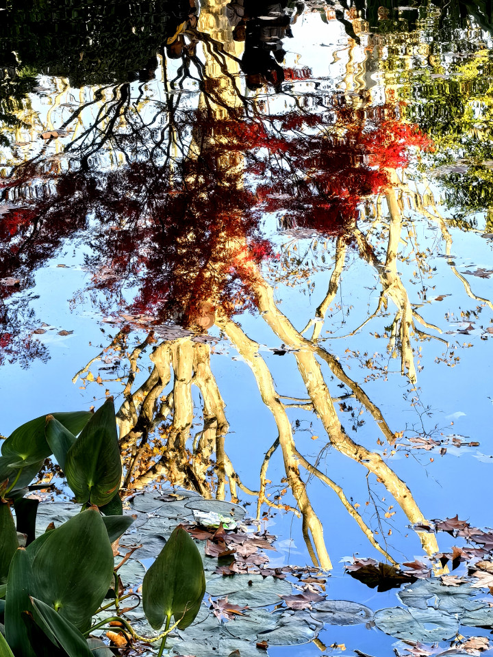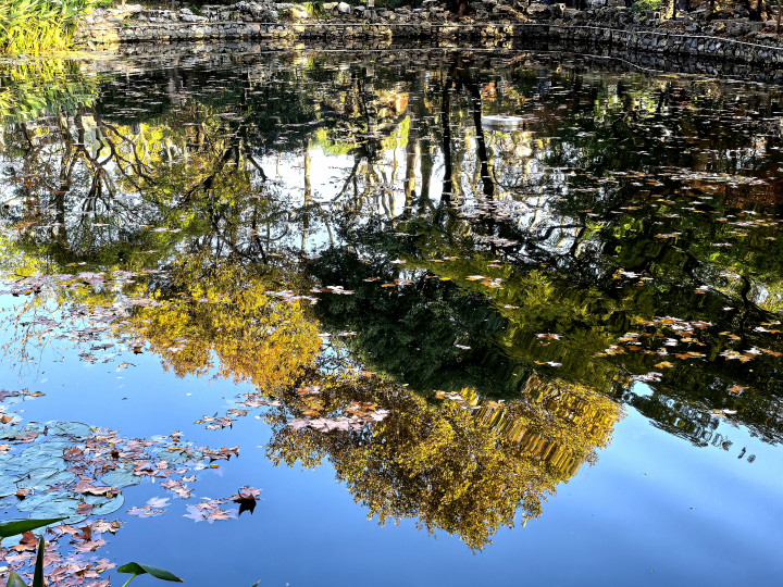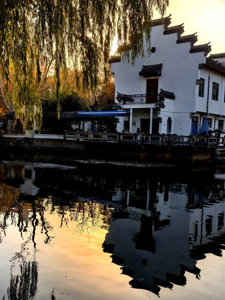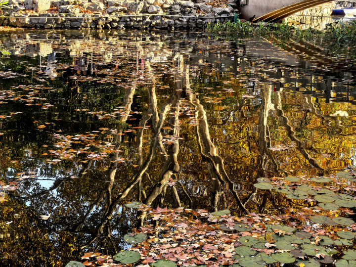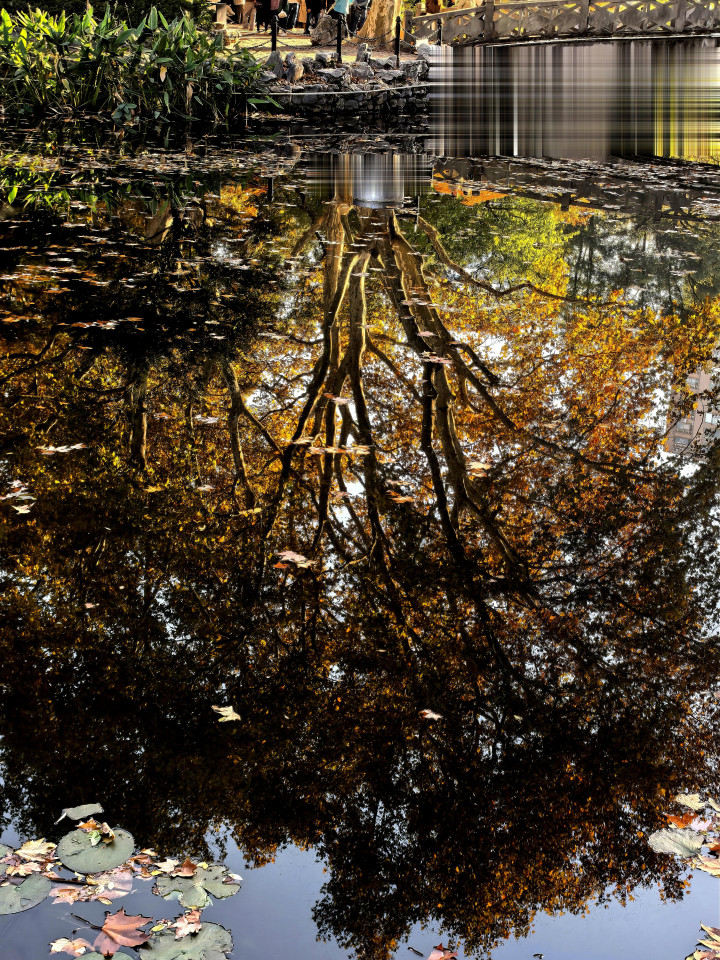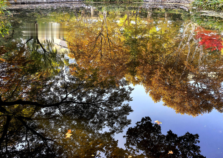 湖边的秋色,几座小秋连接着湖中的小岛和小河。
