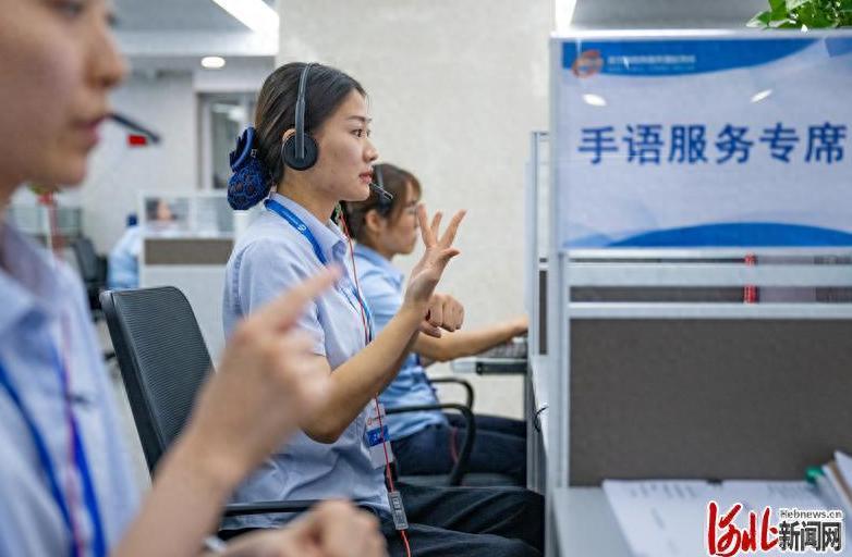 2024年,河北省12345政务服务便民热线话务服务现场,手语服务专席话务员在为听障人士服务。河北日报赵杰摄