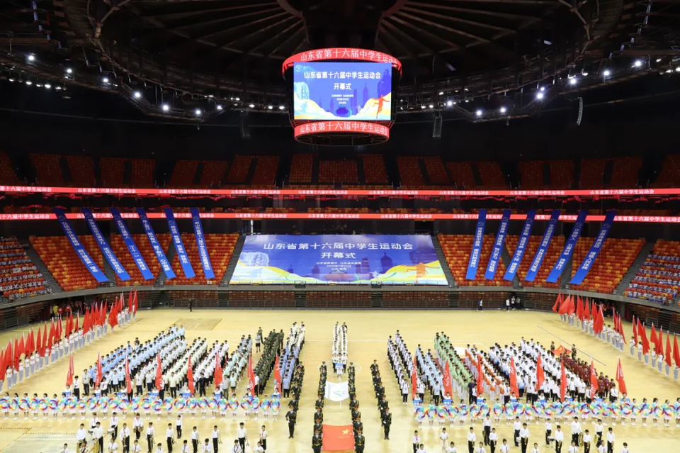 本届运动会由山东省教育厅、山东省体育局主办,青岛市教育局承办,开幕式主题为“强身健体·荣耀齐鲁”。来自16市的运动员代表及青岛市41所中小学校近5000名师生通过运动员入场风采展示、特色文体展演等形式,集中展现了全省学校体育工作成果和学生积极向上的青春风采,彰显了齐鲁文化的深厚底蕴与青岛海洋之都的独特魅力,呈现了一场兼具体育特色与文化内涵的视听盛宴。