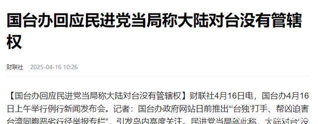 财联社2024年4月16日报道国台办回应民进党当局称大陆对台没有管辖权